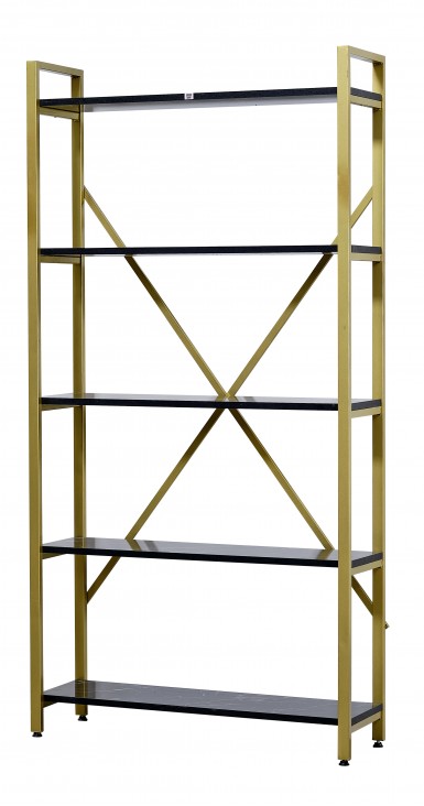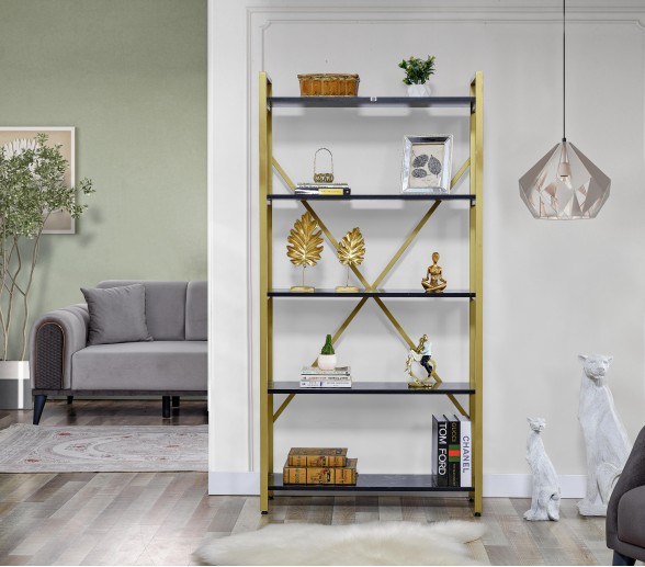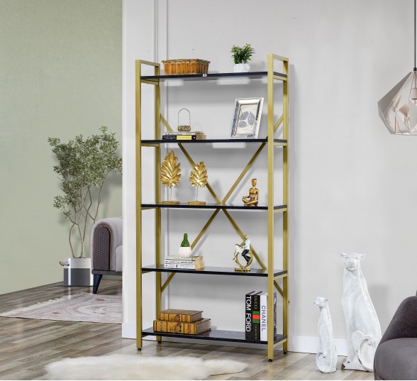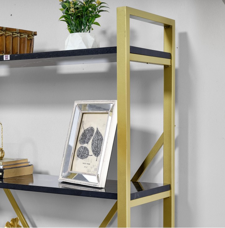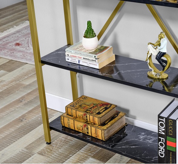 GOLD Metal Kitaplık 5 Raflı Siyah Mermer Desenli Altın Kitaplık